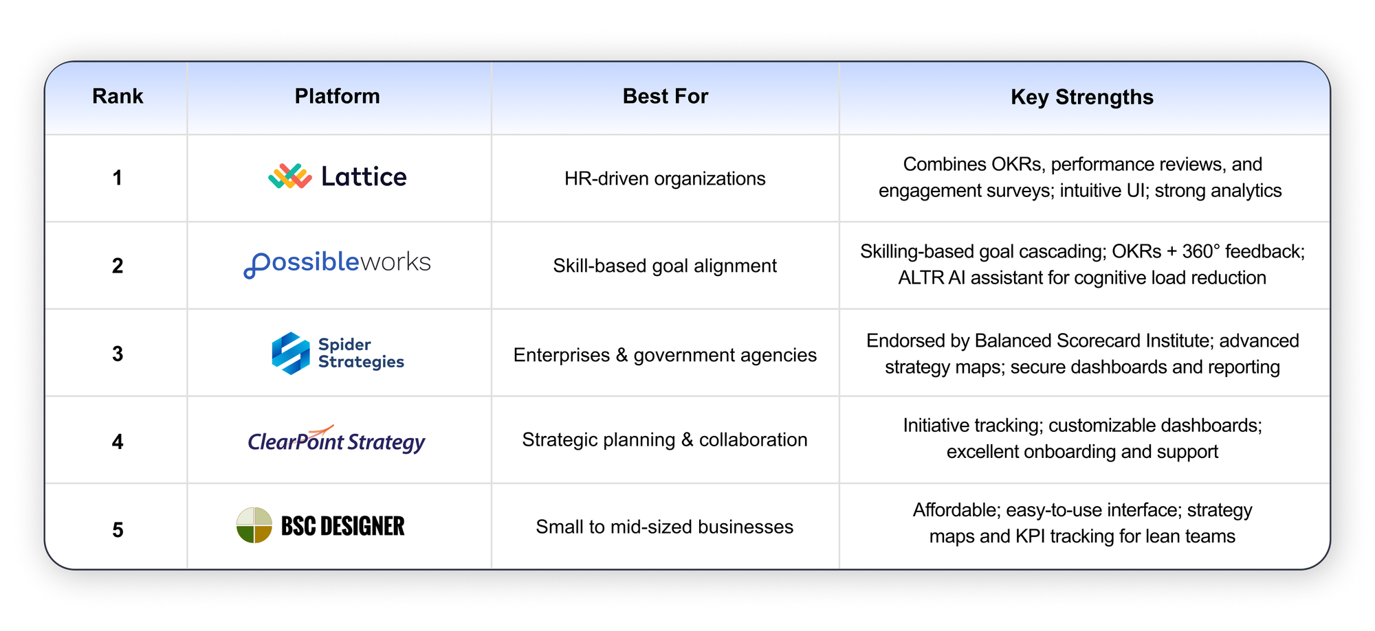 The best platforms turn performance data into strategic intelligence, helping leaders make informed, timely decisions.
